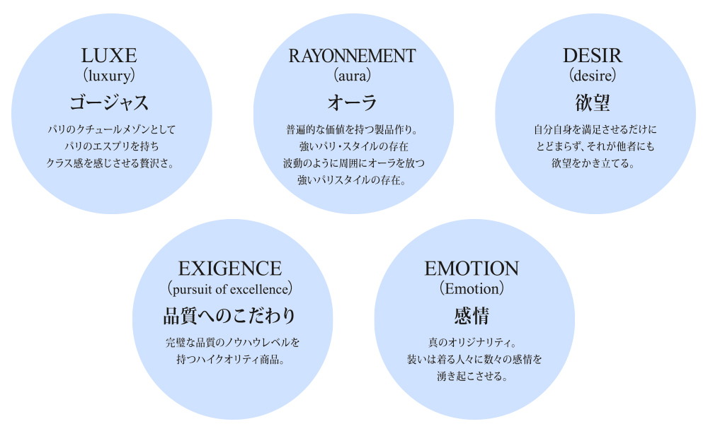 愛娘の為にデザインしたドレスが社交界の評判を呼び1889年より親子の服を扱うブティックへと改装、やがてフランスを代表するメゾンとなっていったのです。「エレガンスの代名詞」と呼ばれた彼女の業績はフランス政府からも高く評価され、1927年にはオートクチュール界のみならず女性として初めてレジオン・ド・ヌール十字勲章を授与されています。彼女亡き後も「ジャンヌの精神」は後継のデザイナー達に受け継がれ、2019年からクリエイティブ・ディレクターにブルーノ・シアレッリを迎え現在のファッショントレンドをリードするブランドとなっています。