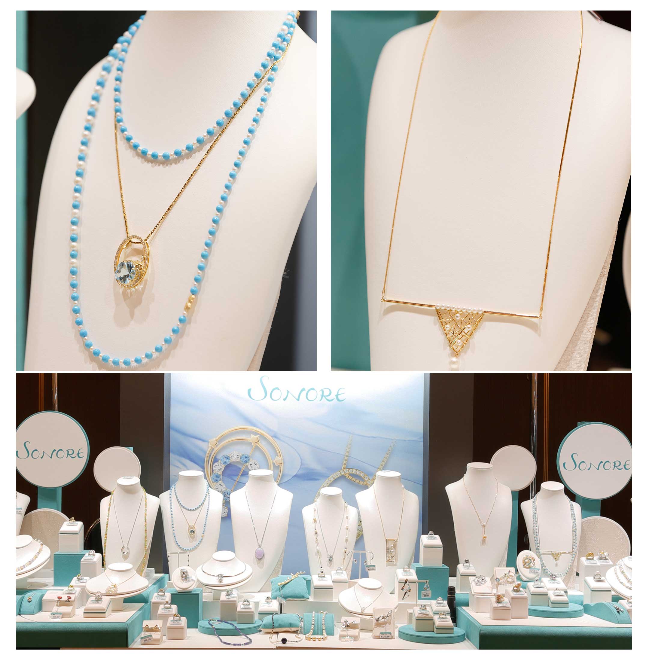 SONOREの大半は半貴石である事から、価格もキャリア達には抵抗がありません。様々な色の洋服に合わせて、様々な時と共に一つのネックレスが溶け込む、一つの指輪が華を添える、その為に石のカットは海外で特別にオーダーし輝きの美しさに重点を置きました。