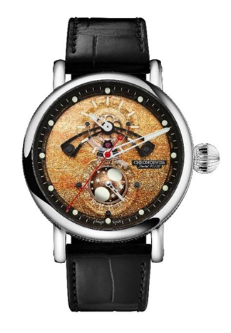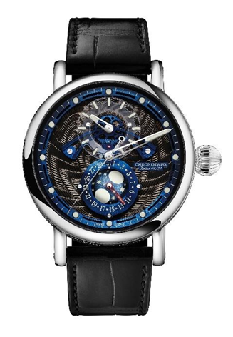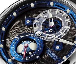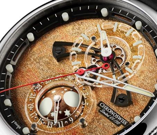 「スペースタイマー」コレクションは、12時位置に本来ダイヤルの下に隠れて見えないギア(歯車)を見せるオープンギアシステムを採用した時表示が、中心には分・秒表示が、そして6時位置には日付付きムーンフェイズを搭載するクロノスイス初の表示機構を搭載しました。
