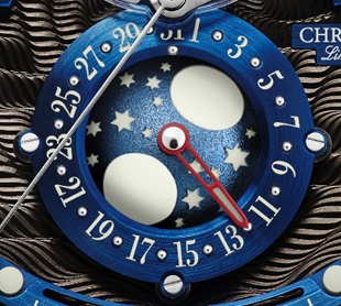 63個のパーツで構成されたダイヤル、メテオコートを施したハンドギョーシェ仕上げ、スケルトン化されたギアトレイン、サンドブラストCVDコーティング(ブルー)、円柱状のスーパールミノバインデックス(分表示)、チタン製半球体ムーンフェイズ、スーパールミノバで描かれた月と星 |