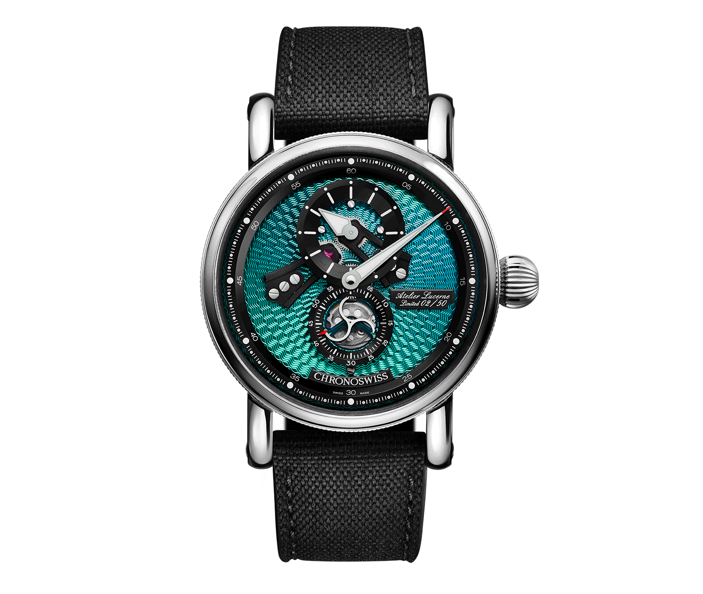 『オープンギア レ・セック オーロラ』 クロノスイスは最新の技術と伝統的なハンドメイドのギョーシェ模様によって、複雑な色の変化を楽しむことができる文字盤を送り出している唯一のブランドです。オーロラのもつ、捉えどころなく変化する色を表現するために「Chemical Vapor Deposition(化学蒸着)」という高度な技術が使用され、このユニークなメタリックコーティング技術によって、光の入射角度により常に新しい命が吹き込まれるユニークな文字盤を生みだしています。またオーロラの持つ極光を思わせる陰影を生みだすために、百年以上前の手動旋盤を職人が操作して、ひとつひとつ丁寧な手彫りが施されています。 |