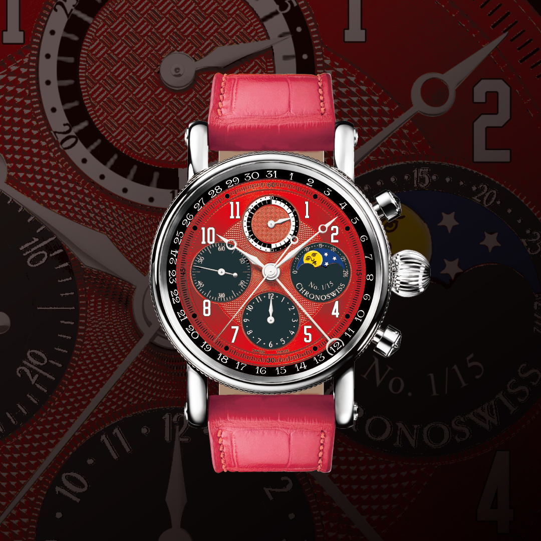 力強いレッドカラーの文字盤に、時・分・秒針やホワイトのインデックスが映えるデザインを採用。3 時位置のムーンフェイズには、限定 15 本の証であるシリアルナンバーが刻印されています。